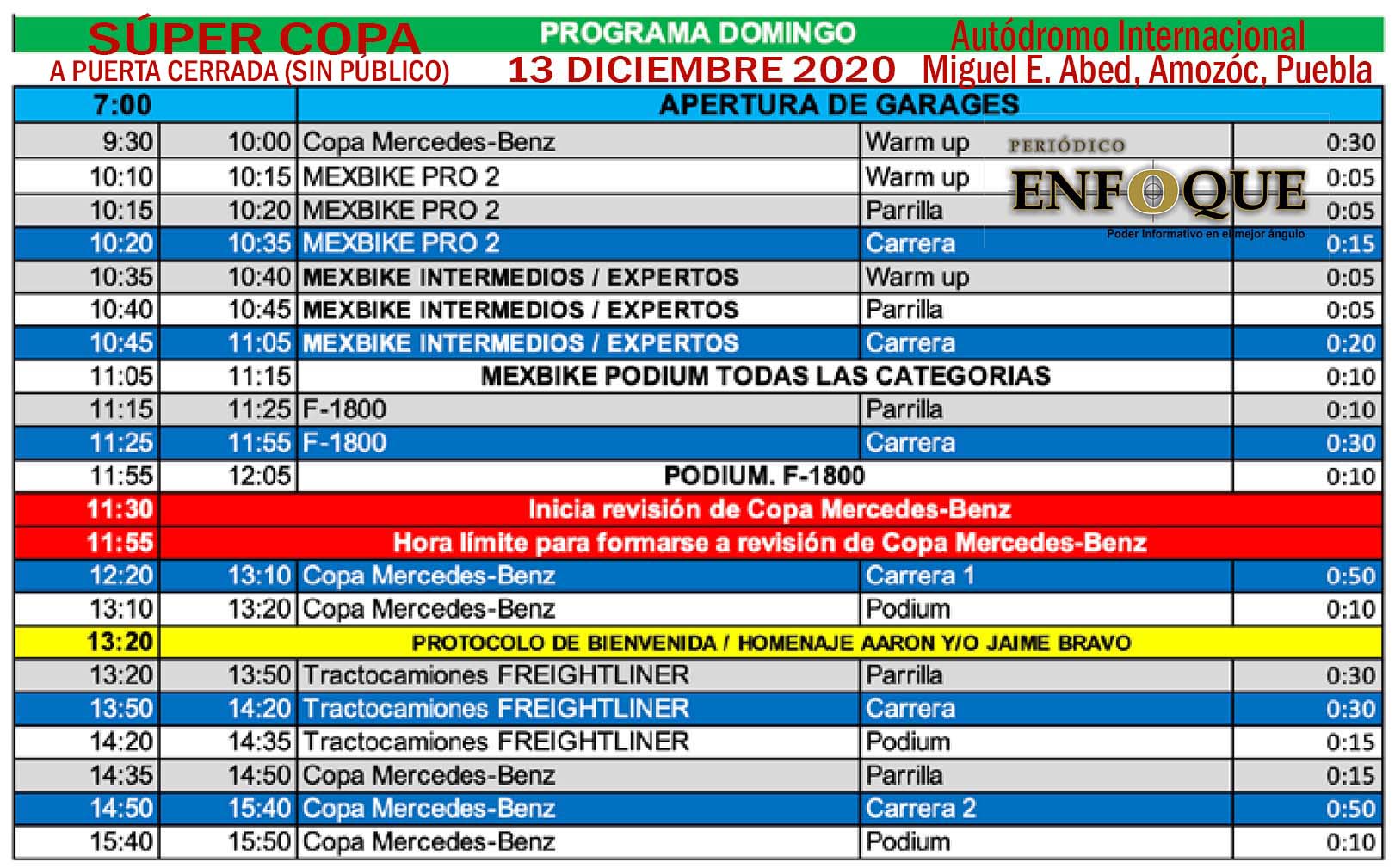 Puebla, Puebla, México. Súper Copa, sábado 12 y domingo 13 de diciembre de 2020, a puerta cerrada (sin público), en el Autódromo Internacional Miguel E. Abed, Amozóc, Puebla. Categorías incluidas: Fórmula 1800, Mexbike (motos), Copa Mercedes-Benz y Tractocamiones Freightliner