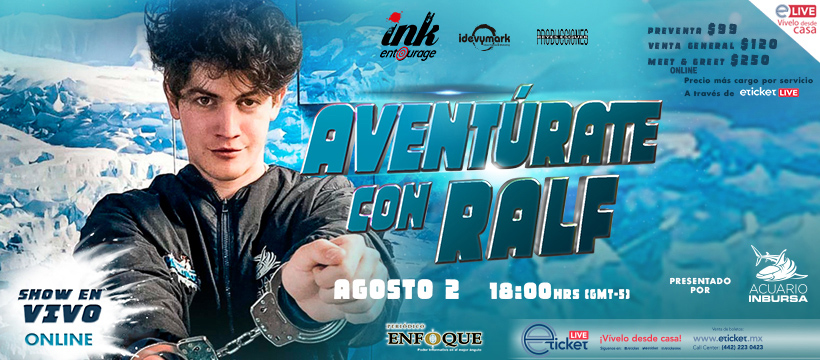 Puebla, Puebla, México. Aventúrate con Ralf, Domingo, Show Online, 06:00 P.M. 02 de agosto de 2020. Duración aproximada del show 2 horas. Transmitido en vivo desde el Acuario Inbursa de la Ciudad de México.