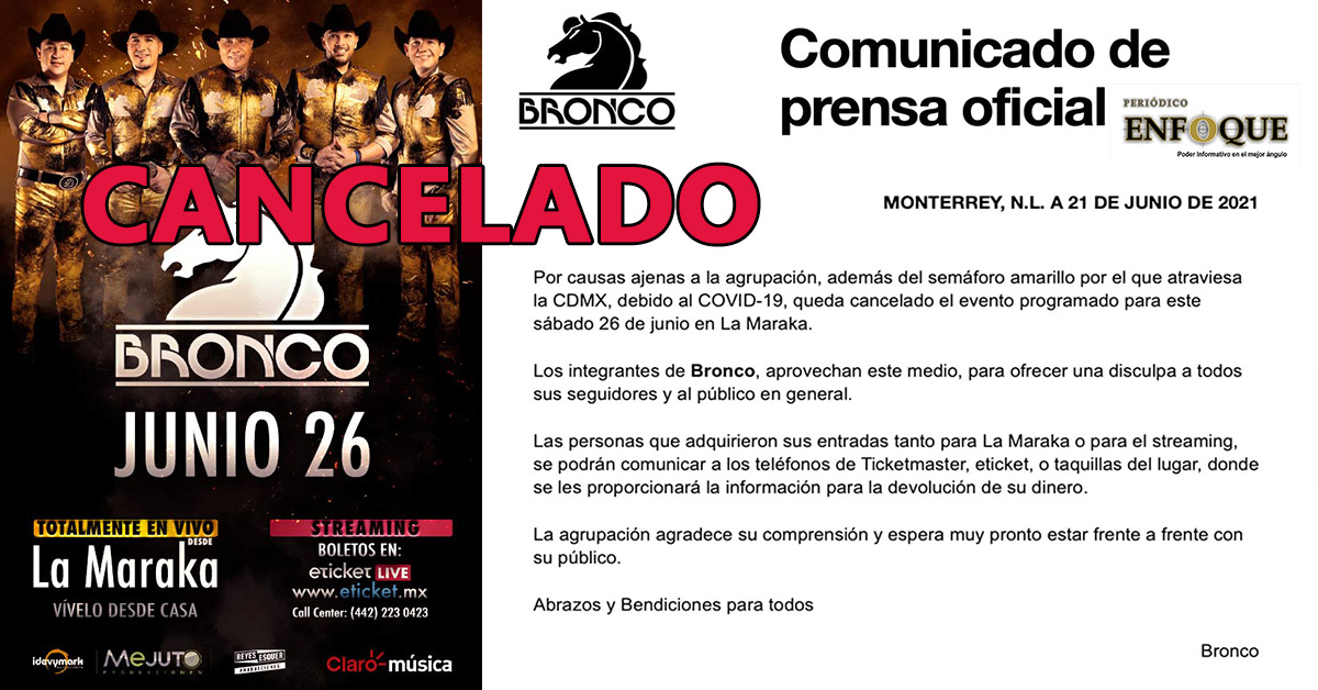 Monterrey, N, L. El grupo musical Bronco, canceló su presentación del 26 de junio de 2021, por semáforo amarillo de COVID- 19 y causas ajenas. La agrupación lanzó un comunicado de prensa, tal y cual está escrito con puntos, comas y resaltado en mayúsculas en donde manifiestan lo siguiente: