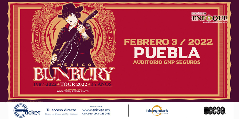 Puebla, Puebla, México. Enrique Bunbury Tour 2022, 35 Años, jueves 03 de febrero de 2022 en el Auditorio GNP Seguros, Puebla, Puebla. A las 09:00 P.M.