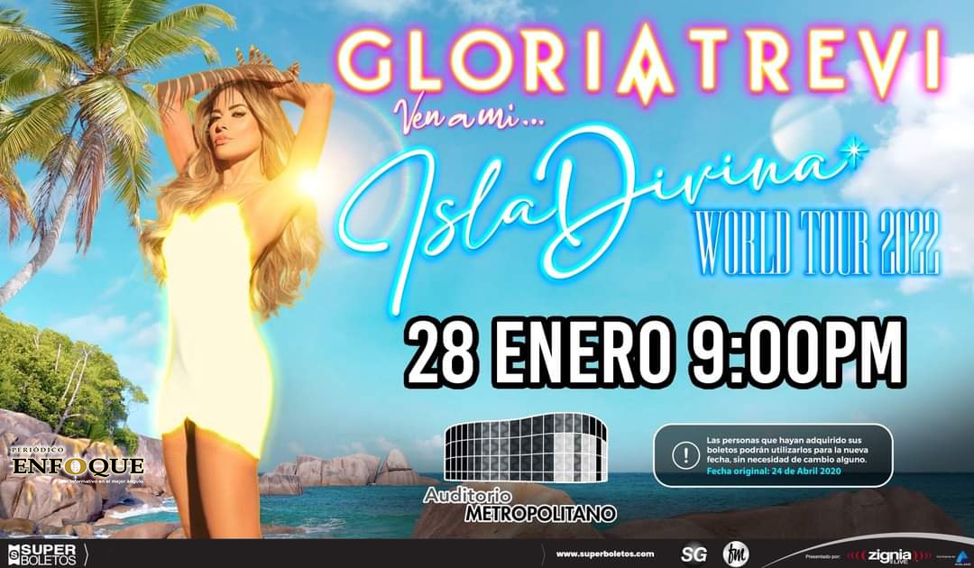 Gloria Trevi, quien el 15 de febrero de 2022 cumplirá 54 años de edad, y que es compositora, cantante, productora, actriz y empresaria mexicana, se presentará con: "Ven a mi Isla Divina World Tour 2022”, la gira sucesora de “Diosa de la noche world tour”, el 28 de enero de 2022 a las 09:00 P.M. en el Auditorio Metropolitano de la ciudad de Puebla, Puebla.