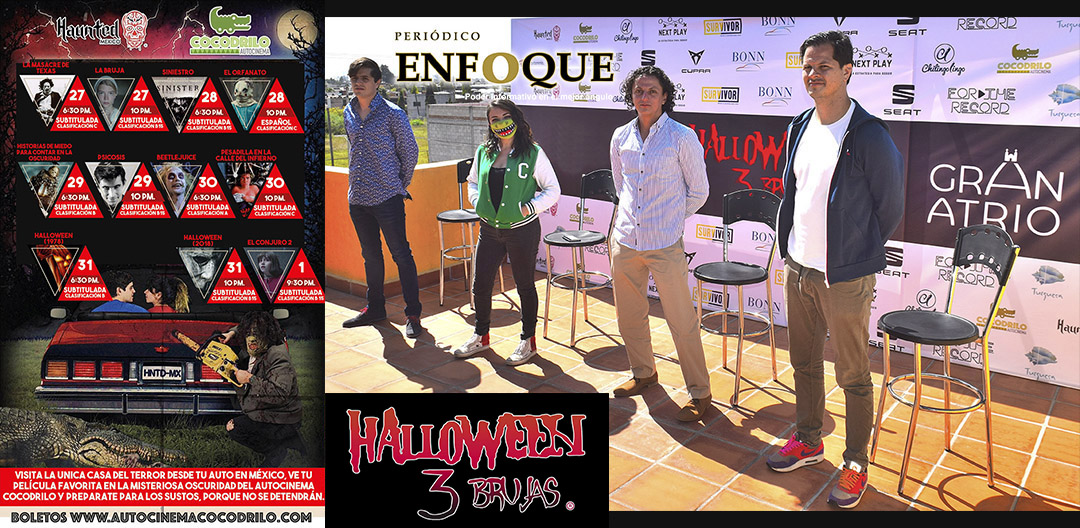 En rueda de prensa; Mike Arana Dir. de “Halloween 3 Brujas”, Ana Luisa Morales Linares de “Autocinema Cocodrilo”, David de “Haunted México Studios” y Sergio Pérez de “Gran Atrio”, explicaron la asociación de estas empresas para el próximo evento relacionado con la temporada de Halloween: