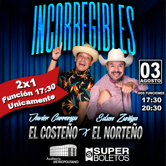Incorregibles, El Costeño & El Norteño, Puebla, jueves 03 agosto de 2023, 2X1 en la 1er función de 05:30 P.M. la función de 08:30 P.M. a precio normal. Auditorio Metropolitano.