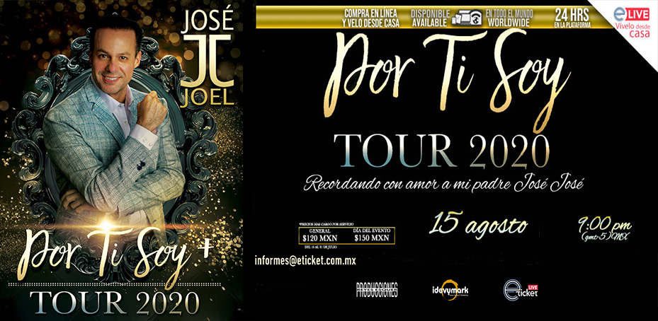 Puebla, Puebla, México. José Joel, se presentará con una nueva fecha para el 15 de agosto de 2020 y su Show Online en vivo desde el garaje de su casa y estará acompañado por sus músicos, 09:00 P.M. Por la plataforma www.eticket.mx. Tendrá duración de una hora y 50 minutos.