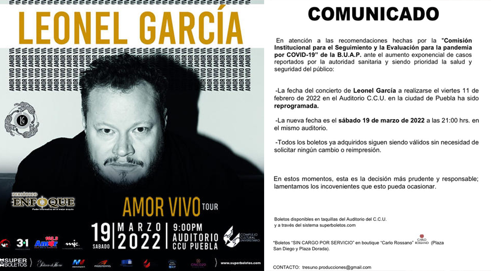 Leonel García en Puebla, nueva fecha reprogramada para 19 de marzo de 2022, fecha anterior 11 de febrero de 2022. La empresa organizadora Tresuno Producciones lanzó un comunicado al público en general:
