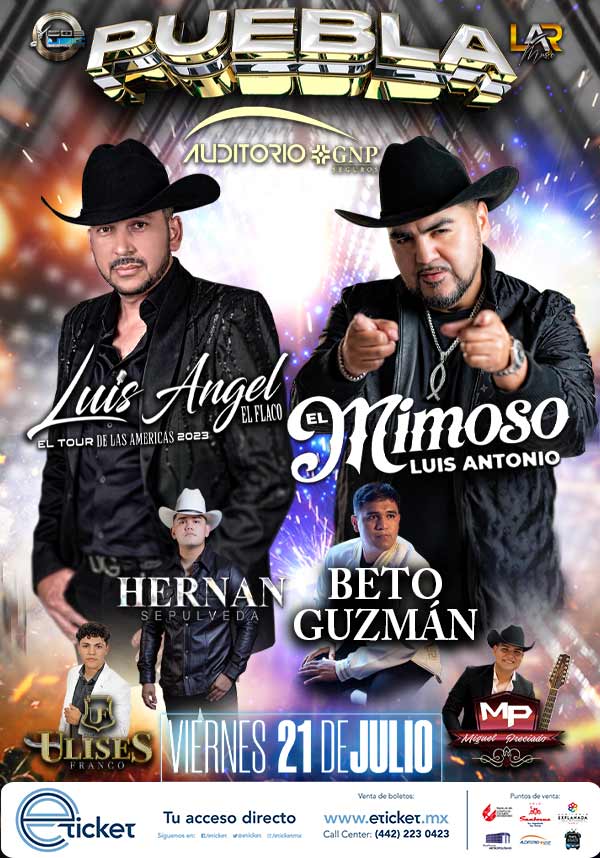 Luis Ángel "El Flaco" y El Mimoso, Puebla, viernes, 21 de julio de 2023, Auditorio GNP Seguros, a las 08:30 P.M. Además, también tocarán: Hernán Sepúlveda, Beto Guzmán, Ulises Franco y Miguel Preciado.