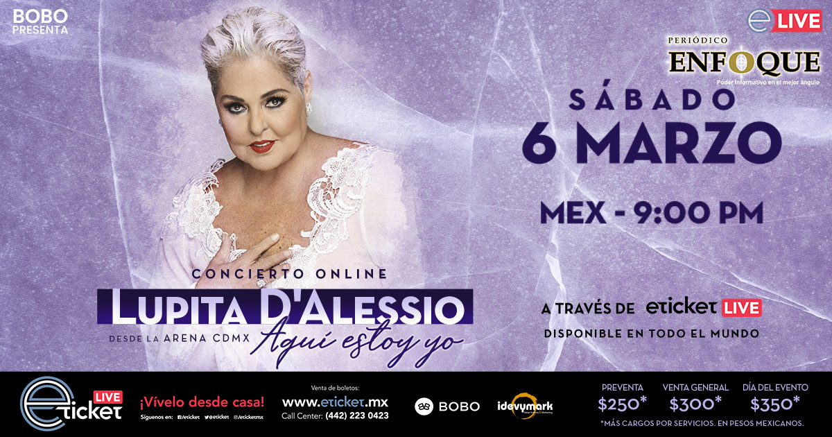 Ciudad de México. Lupita Lupita D'Alessio presentará su primer concierto online “Aquí estoy yo” el sábado, 06 de marzo de 2021 a las 09:00 P.M. (Horario de la ciudad de México)