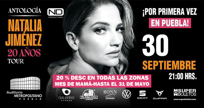Natalia Jiménez en Puebla, y para seguir festejando el mes de mamá, 20% de descuento en todas las zonas sobre los precios anunciados desde hoy y hasta el 31 de mayo de 2023.