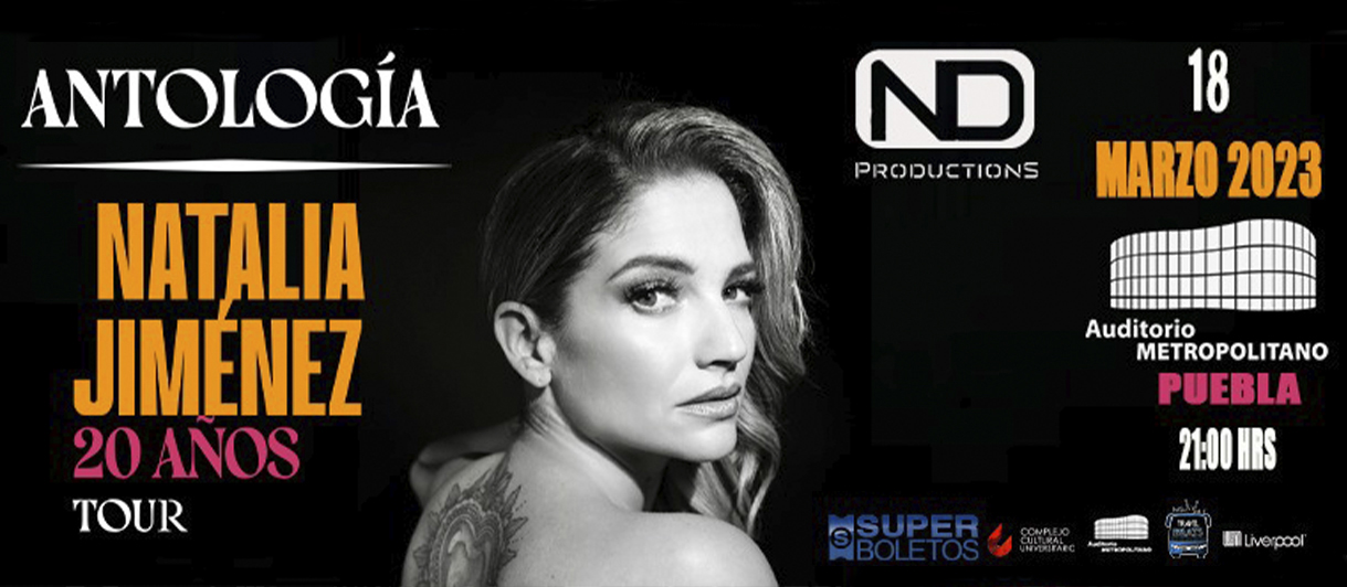 La cantante, compositora y Mezzosoprano lírica Natalia Jiménez llegará a Puebla, presentando “Antología 20 años tour” y todos sus éxitos, acompañada de mariachi, el 18 de marzo de 2023 en el Auditorio Metropolitano, a las 09:00 P.M