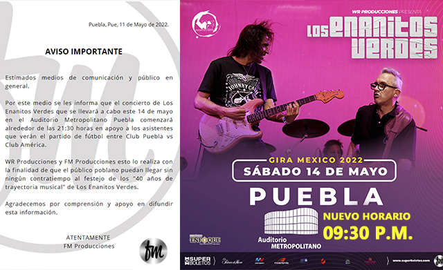 Estimados medios de comunicación y público en general. Por este medio se les informa que el concierto de Los Enanitos Verdes que se llevará a cabo este 14 de mayo en el Auditorio Metropolitano Puebla comenzará alrededor de las 21:30 horas en apoyo a los asistentes que verán el partido de fútbol entre Club Puebla vs Club América. WR Producciones y FM Producciones esto lo realiza con la finalidad de que el público poblano puedan llegar sin ningún contratiempo al festejo de los "40 años de trayectoria musical" de Los Enanitos Verdes. Agradecemos por comprensión y apoyo en difundir esta información.