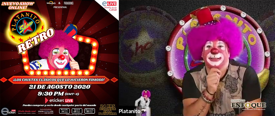 Puebla, Puebla, México. Platanito Show se presentará con su show “Retro Online”, con sus chistes clásicos que lo hicieron famoso, viernes, 21 de agosto de 2020 a las 09:30 P.M. (horario de la ciudad de México).