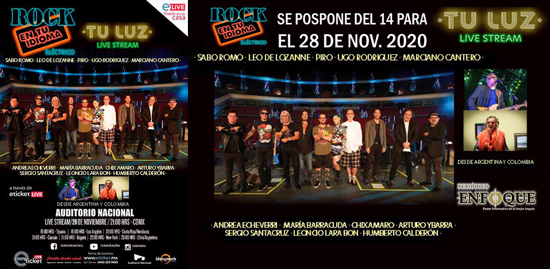 Puebla, Puebla, México. Rock En Tu Idioma Eléctrico “Tu luz” live stream desde el Auditorio Nacional, se pospone del 14 para el 28 de noviembre de 2020 a las 09:00 P.M. (Horario de la ciudad de México).