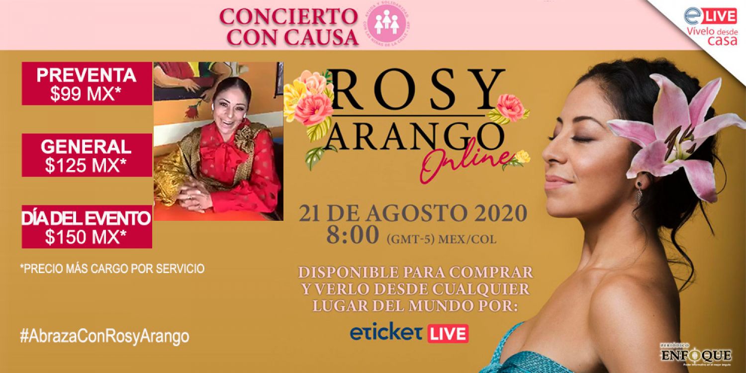 Puebla, Puebla, México. Rosy Arango, concierto a beneficio de La Casa Hogar “Ayuda y Solidaridad con las Niñas de la Calle I.A.P.” Viernes 21 de agosto de 2020, a las 08:00 P.M. (horario de la ciudad de México).