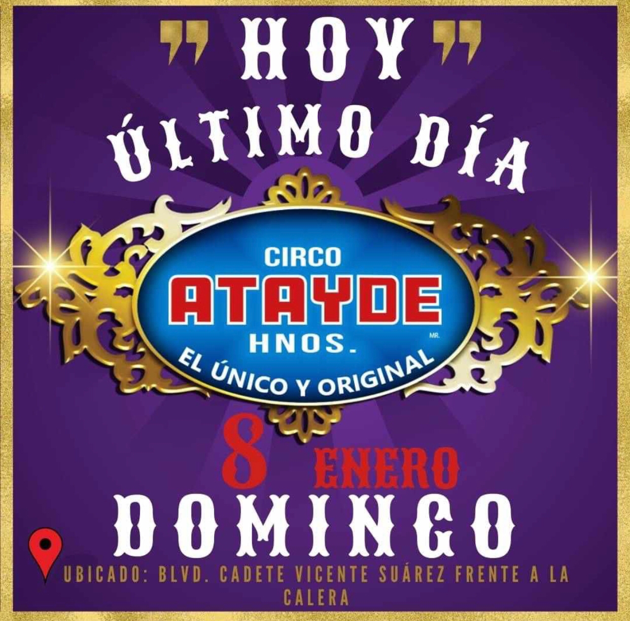 ¡Se va!, ¡Se va!, ¡Hoy 08 de enero de 2023, último día del Circo Atayde Hnos.! En la ciudad de Puebla. Instalado en Boulevard Vicente Suárez (frente a zona militar y la calera). Funciones: Domingo 11:30 A.M., 4:00 P.M., 6:15 P-M. y 8:30 P.M.