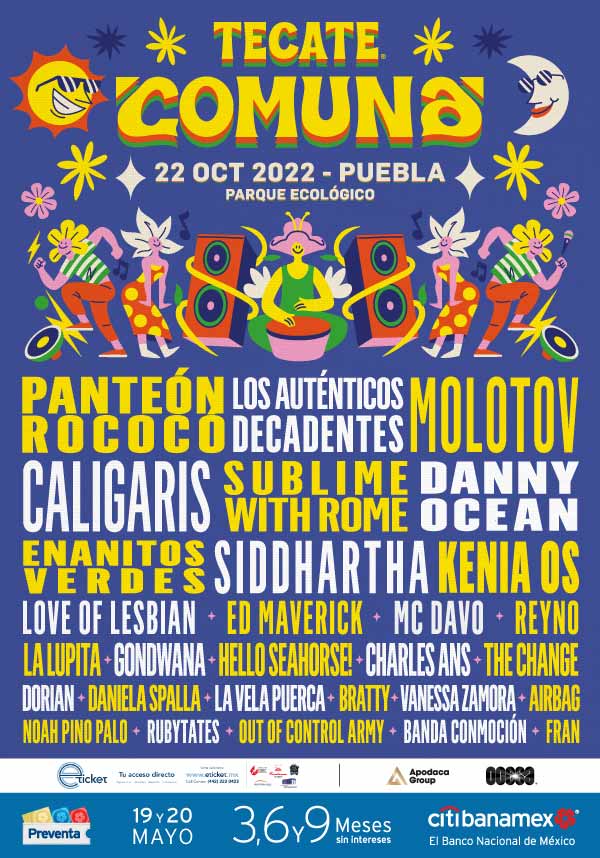 Tecate Comuna 2022, se presentará en Foro Cholula, los días; sábado 22 y domingo 23 de octubre de 2022, a las 12:00 Hrs. 3 escenarios, más de 28 bandas, más de 10 horas de música, zona de hidratación gratuita, renta de lockers, asistencia médica, zona de food trucks, experiencias de marcas.