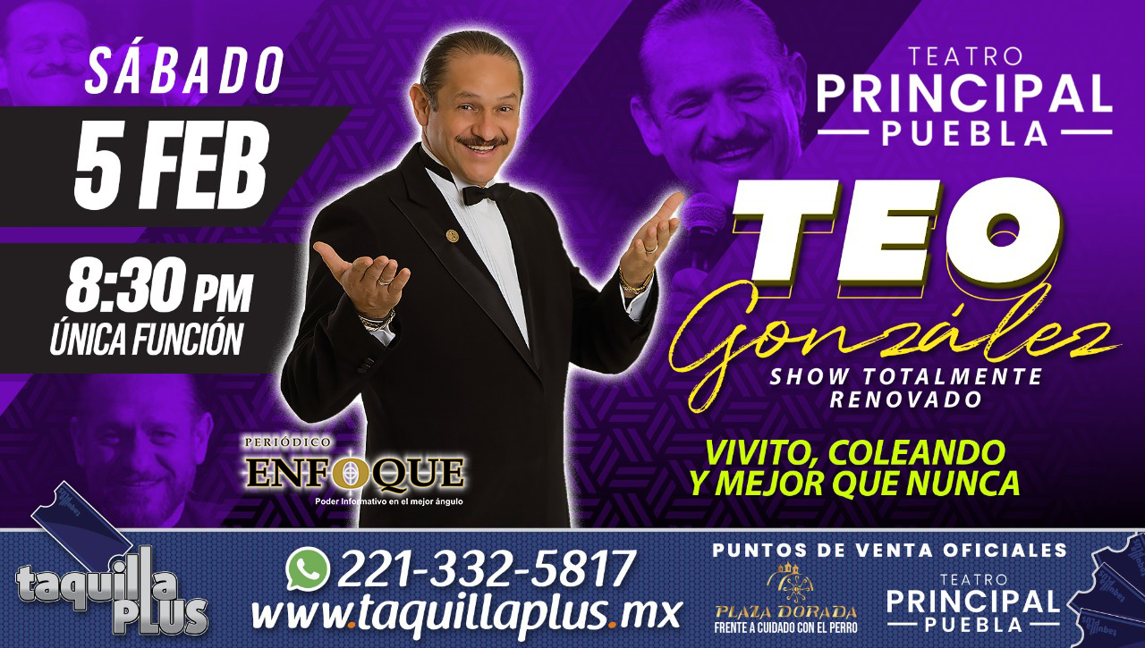 Teo González, “Vivito, coleando y mejor que nunca”, con un show totalmente renovado, 05 de febrero de 2022, 08:30 de la noche, en el Teatro Principal de la ciudad de Puebla, Puebla, México.