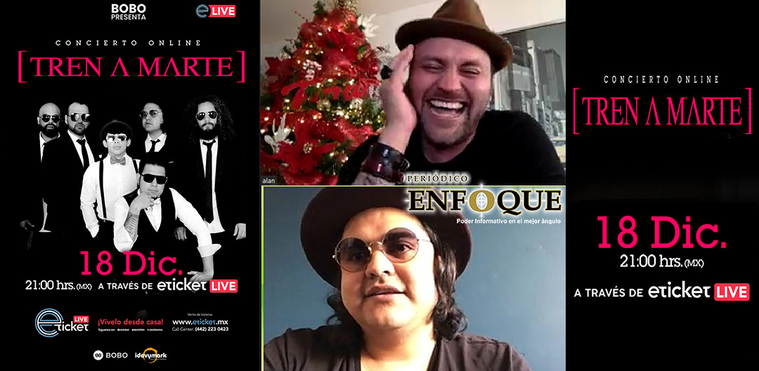 Puebla, Puebla, México. Tren a Marte, la banda de música “charles- pop”, se presentará con su show on line el viernes 18 de diciembre de 2020 a las 09:00 P.M. (Horario de la ciudad de México). El evento tendrá duración de una hora con 10 y hasta 30 minutos, se realizará y transmitirá en vivo por streaming desde unos estudios cerca de la central de abastos en la ciudad de México.