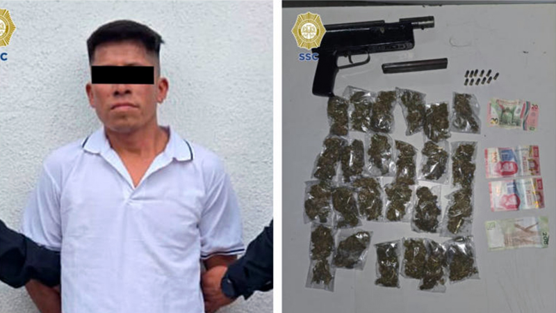 Al realizar una revisión preventiva, se le encontraron 24 bolsas con hierba similar a marihuana y una subametralladora con cargador, sin que acreditara su portación legal. El detenido, de 41 años, fue puesto a disposición del Ministerio Público, quien determinará su situación jurídica.