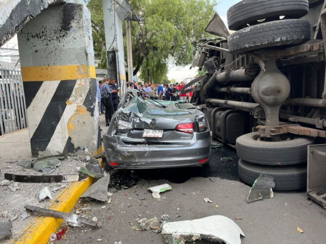 Imágenes compartidas por Protección Civil de Tlalnepantla muestran cómo el camión perdió las llantas delanteras después de que subió a las escaleras del puente, además de que el cofre se destruyó en su totalidad. En tanto, el automóvil color gris que al parecer se encontraba estacionado a un lado del puente cuando ocurrió el percance, quedó exactamente abajo de la unidad.