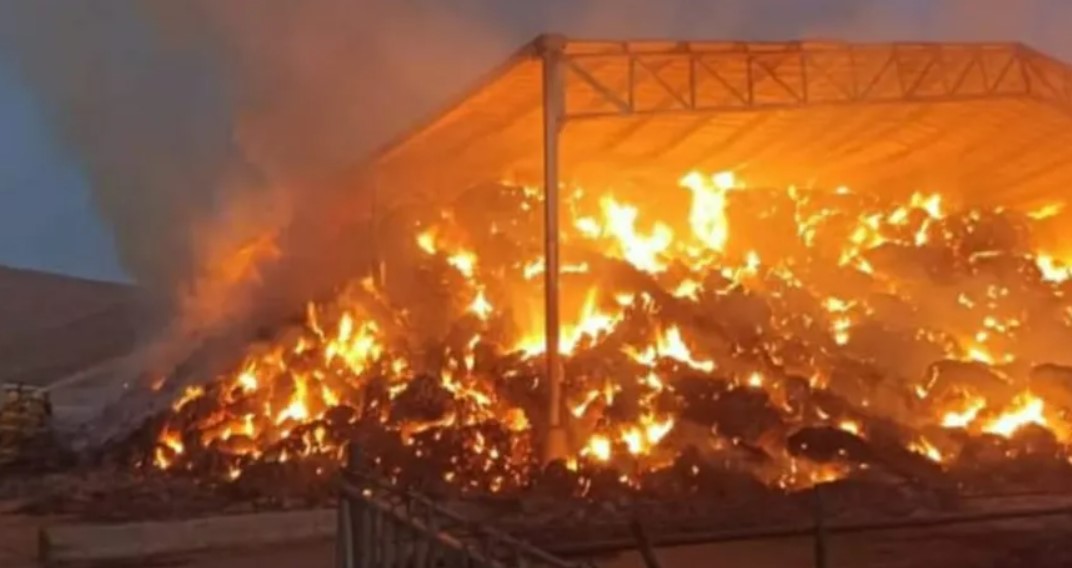 Los rescatistas acudieron al lugar donde las llamas que alcanzaron varios metros de altura, se propagaron rápidamente sobre el forraje apilado bajo la estructura metálica del tejaban de grandes dimensiones.