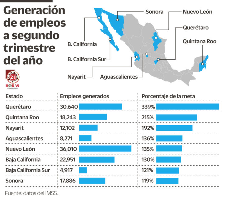Este crecimiento en el empleo durante el sexto mes del año fue de 6.3%, el segundo más alto a nivel nacional; lo que significó que la entidad se posicionó, únicamente, por debajo de Nayarit (con 7.7%); mientras que la media nacional es de 2.4%.