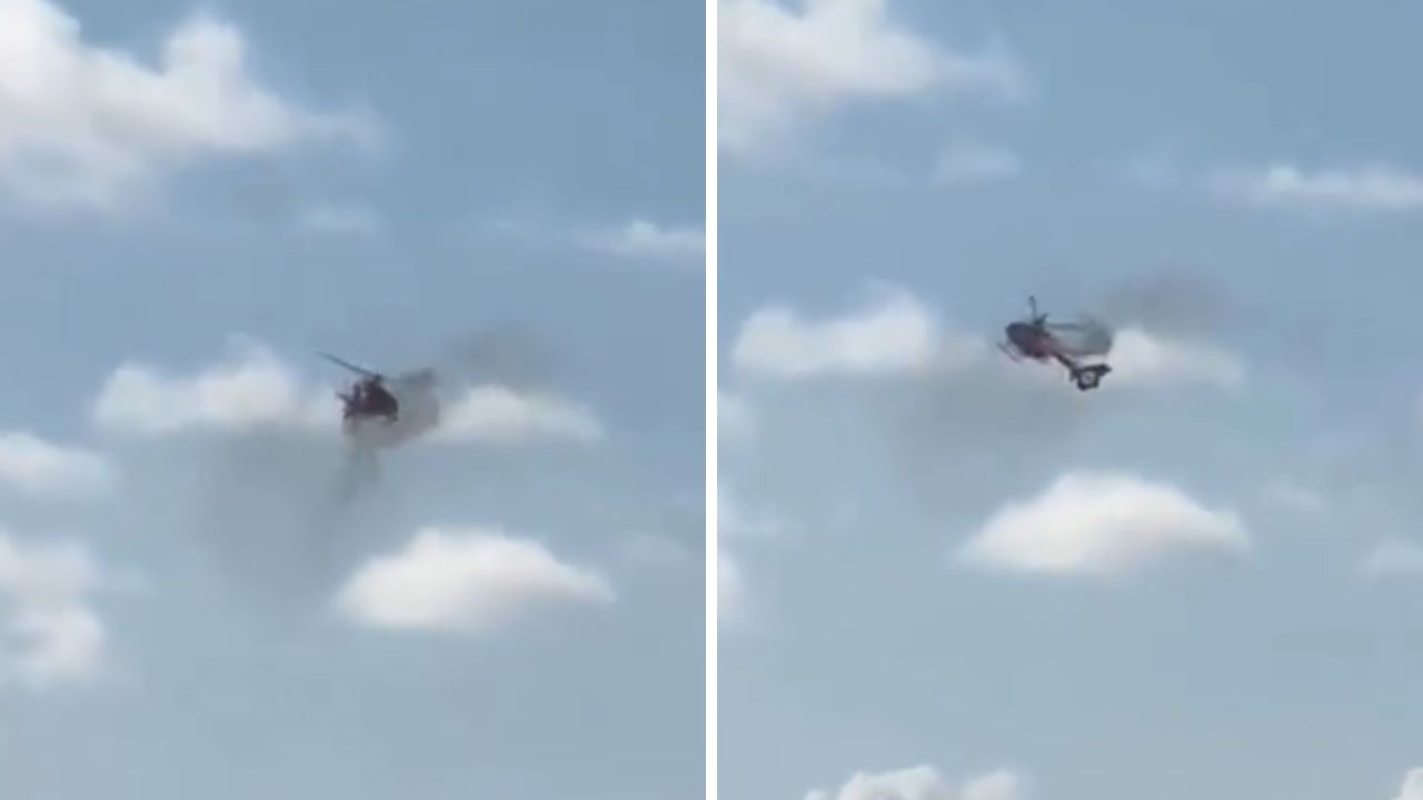 Un video publicado en línea muestra llamas provenientes de la sección media del helicóptero, y una larga columna de humo. Luego, el helicóptero parece partirse por la mitad cuando comienza a girar en espiral y desplomarse al suelo.