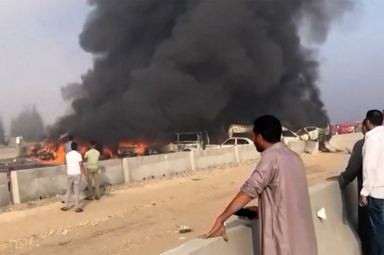 Con base en la información del diario Al Ahram, la carambola dejó los cuerpos de al menos a 18 personas carbonizados; además, publicó una lista de nombres de al menos 53 lesionados. En fotografías publicadas en redes sociales es posible ver un autobús volcado en medio de la vía y a otros vehículos que se prendieron en llamas y quedaron calcinados tras la colisión, mientras se levanta una espesa nube de humo negro.