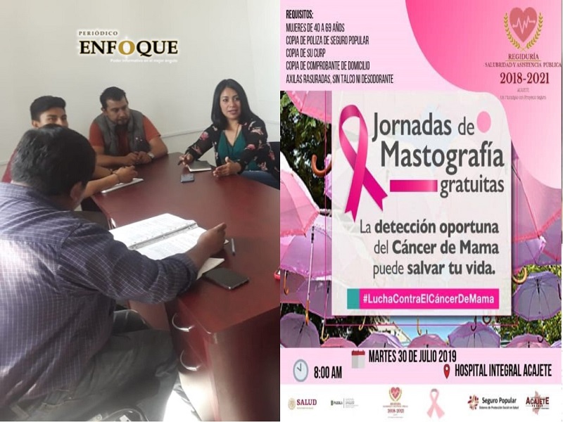 Acajete, Puebla. El Ayuntamiento de Acajete a través de la Regiduría de Salubridad y Asistencia Pública en conjunto con la Secretaría de Salud del estado de Puebla y jurisdicción 09 de Tepexi de Rodríguez realizarán la Jornada de Mastografía gratuita para mujeres de la demarcación.