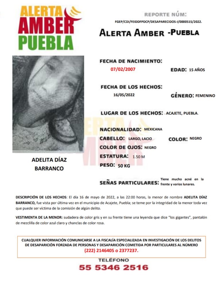 Acusaron a la Fiscalía del estado de Puebla de no iniciar la búsqueda de la joven Adelita, quien al momento de su desaparición llevaba una sudadera gris, pantalón de mezclilla y unas chanclas rosadas.