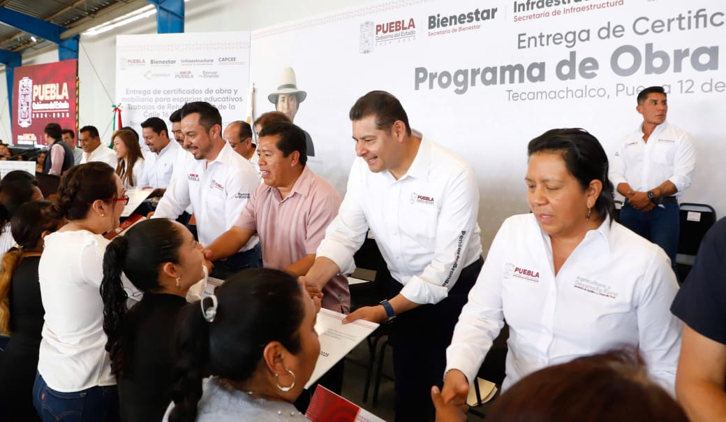 Tecamachalco, Pue.- En su visita por el municipio de Tecamachalco, el gobernador del estado de Puebla, Alejandro Armenta Mier presidió la entrega de 42 apoyos del programa de “Obra Comunitaria” por un monto de 20 millones de pesos, y también inauguró la pavimentación de una obra.