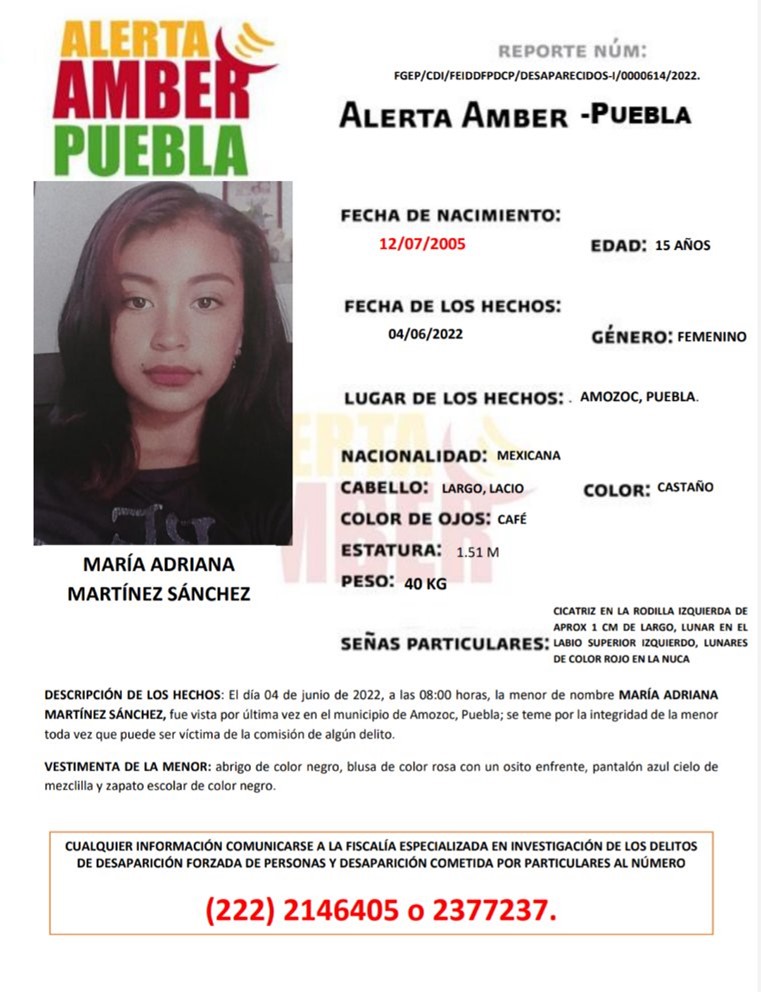 La Fiscalía de Puebla emitió la alerta Amber, donde se informa que el día 4 de junio la menor salió a las 8 de la mañana a la tienda en el municipio de Amozoc y ya no regresó.