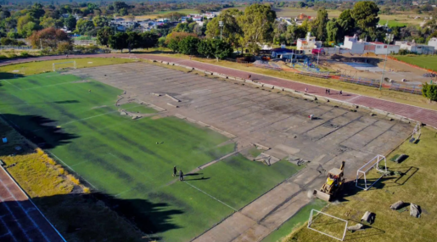 La rehabilitación de la cancha de futbol contempla el suministro y colocación de 6 mil 484.35 metros cuadrados de pasto sintético, rehabilitación de porterías, suministro de redes oficiales banderines y construcción de 332.90 metros de dentellón, mientras que para la pista de atletismo se realizará el suministro y colocación de 247.79 metros cúbicos de tezontle y arcilla roja, escarificado o rastreo de 495.58 metros cúbicos de terreno natural, además de la aplicación de 4 mil 955.78 metros cuadrados de riego de sello.