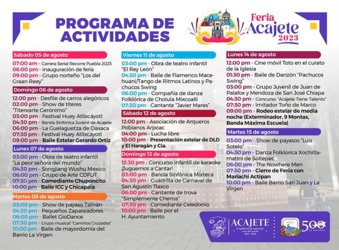 La feria será del 5 al 15 de agosto, en donde las personas de dicha demarcación como de los alrededores, podrán disfrutan de espectáculos, gastronomía, juegos mecánicos, fuegos artificiales y adquirir artesanías propias del municipio de Acajete.