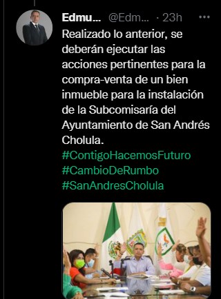 San Andrés Cholula, Pue. – Recientemente, el presidente sanandreseño, Edmundo Tlatehui, dio a conocer que el ayuntamiento ya está iniciando con los procesos de permiso y adquisición de un predio para la construcción de la primera de las subcomisarias, que se planean instalar en las juntas auxiliares del pueblo mágico.