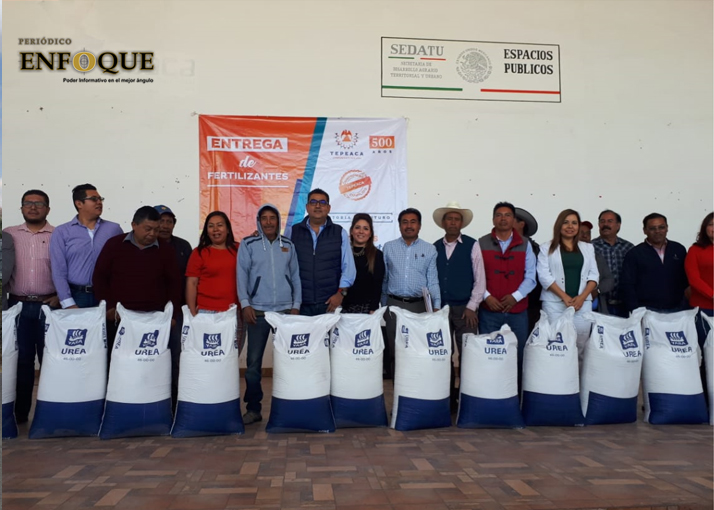 Tepeaca, Pue. Mil doscientos productores del campo se beneficiaron con la entrega de fertilizante para sus cultivos de maíz y frijol; el 50 por ciento del precio total de cada bulto lo pagará el Ayuntamiento de Tepeaca y el otro 50 por ciento lo absorbe el productor beneficiado.