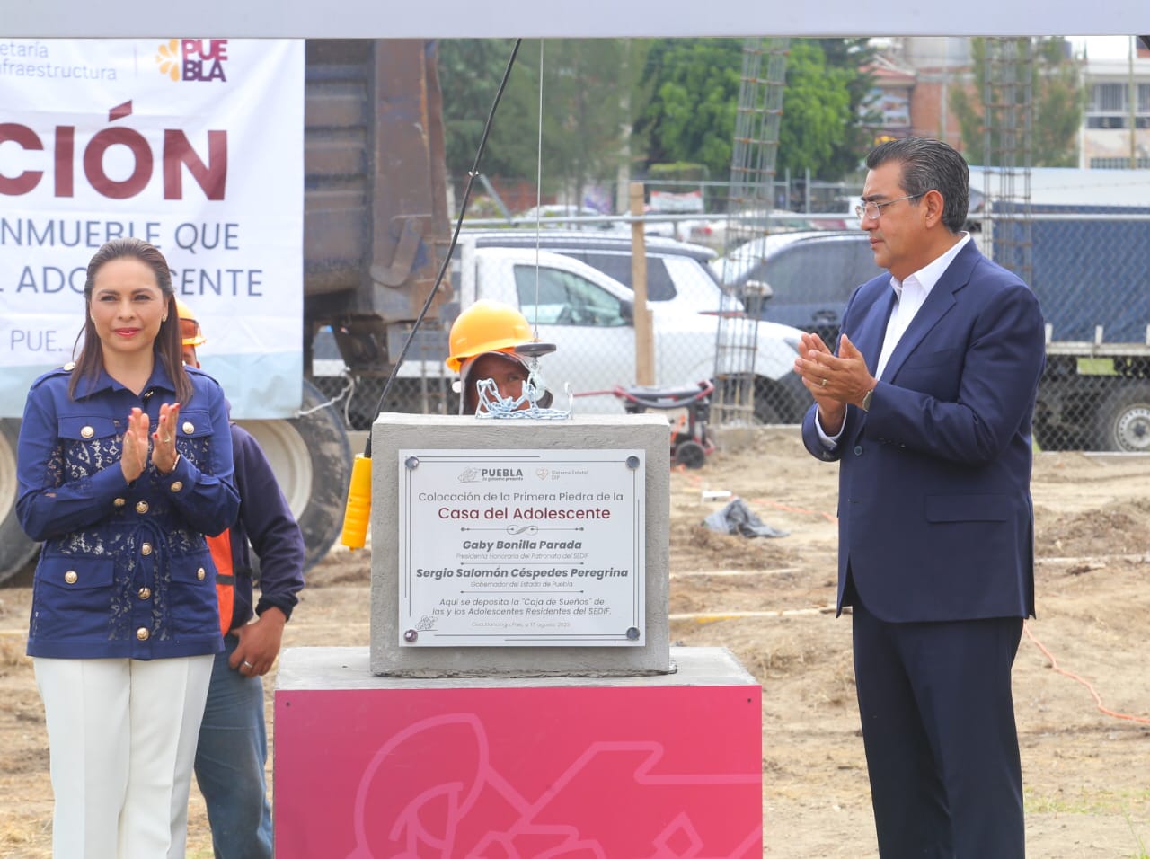 CUAUTLANCINGO, Pue. - Como muestra del compromiso del gobierno estatal, del Sistema Estatal para el Desarrollo Integral de la Familia del Estado de Puebla (SEDIF) y de la sociedad, el gobernador Sergio Salomón y la señora Gaby Bonilla, presidenta honoraria del patronato del organismo, colocaron la primera piedra de la Casa del Adolescente.