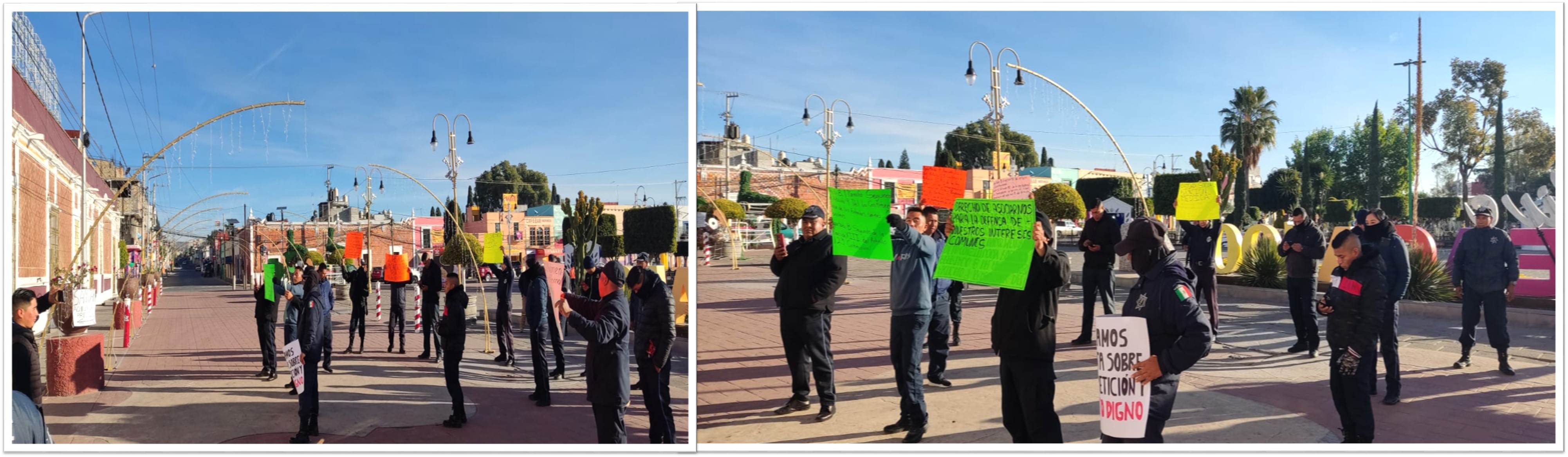 Con pancartas, los elementos exigieron: dos periodos vacacionales al año, trato digno, asistencia medica, así como el pago de su aguinaldo, sin que al momento hayan recibido respuesta por parte de las autoridades.