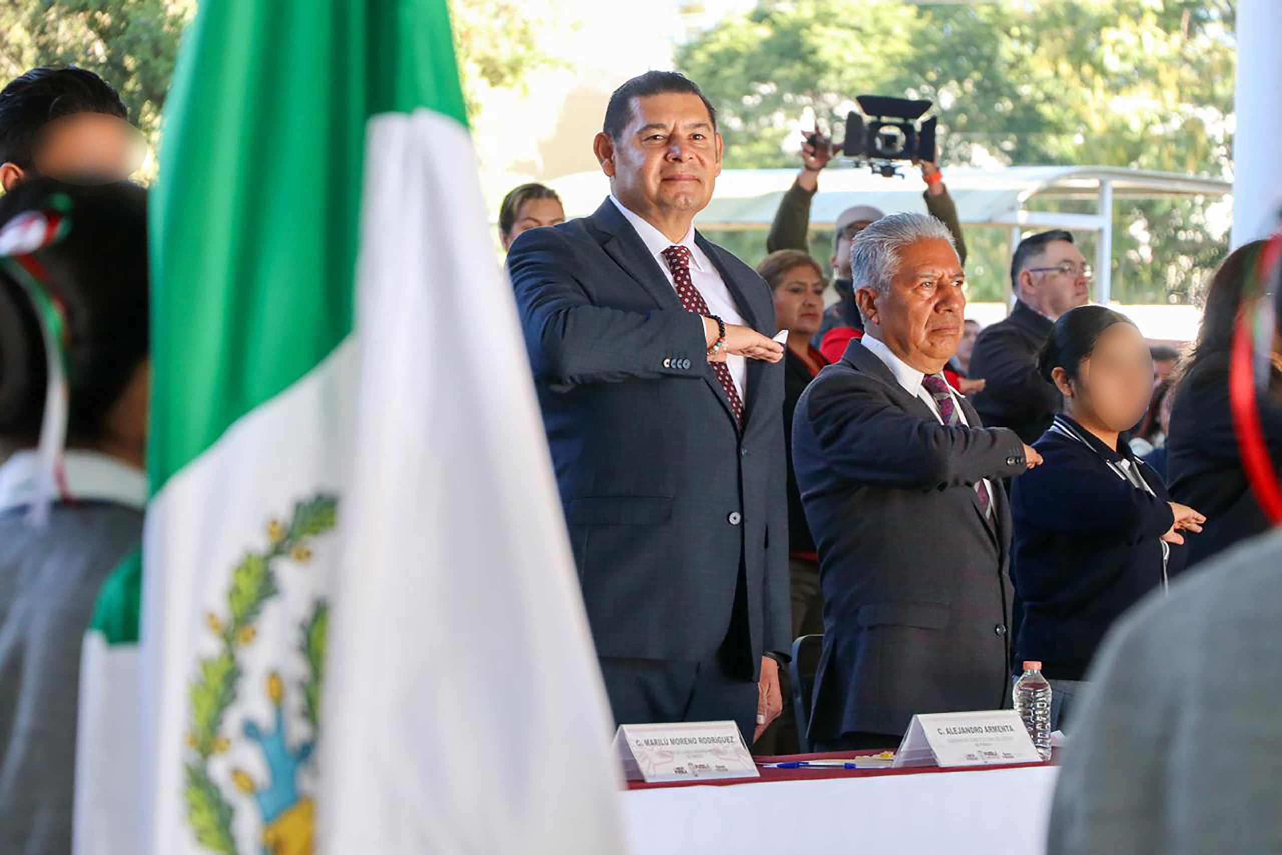 Acatzingo. Este lunes, el mandatario estatal Alejandro Armenta Mier encabezó los honores a la bandera en la Secundaria Federal “18 de Marzo” del municipio de Acatzingo,en sintonía con la visión nacionalista y educativa de la Presidenta Claudia Sheinbaum. Rodeado de su gabinete, autoridades de los tres poderes del estado y estudiantes que portaban con gallardía el lábaro patrio, el mandatario compartió un emotivo mensaje que entrelazó su historia personal con el valor de la educación pública y la defensa de la identidad nacional.