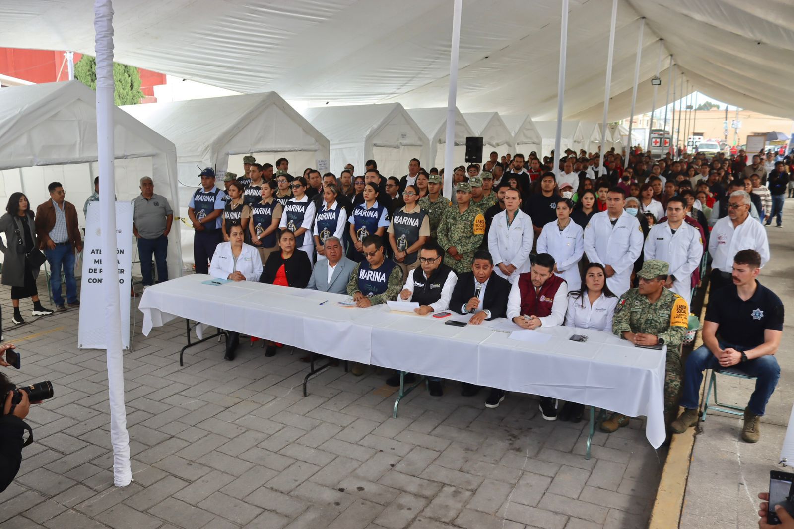 Amozoc.– Con la presencia del Dr. Carlos Alberto Olivier Pacheco, Secretario de Salud del Estado de Puebla; Aurelio Garrido, Secretario Técnico de la Coordinación Estatal para la Construcción de la Paz; el Capitán de Fragata Manuel Romero, Enlace General de la SEMAR; y Francisco Ramos Montaño, Subsecretario de Prevención del Delito y Derechos Humanos del Estado de Puebla, este lunes dio inicio la Mega Jornada de Atención Médica Gratuita en el zócalo municipal de Amozoc.