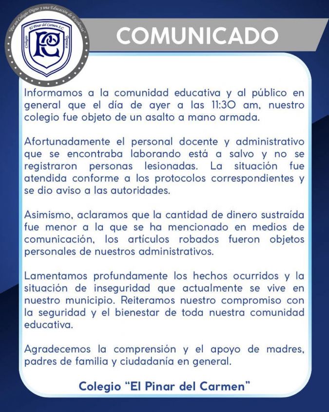 “Agradecemos la compresión y el apoyo de madres, padres de familia y ciudadanía en general”, concluyó el comunicado oficial de la escuela El Pinar del Carmen, descartando las especulaciones que se manejaron en redes sociales y medios informativos sobre este asalto que se suma a los tantos que se han registrado en el municipio en el ultimo año de la gestión municipal 2024-2027.
