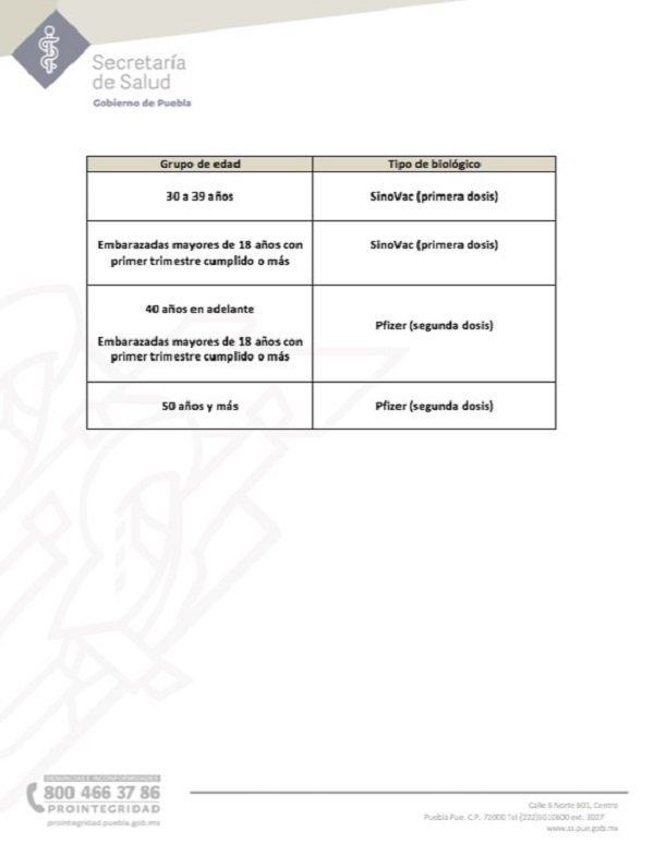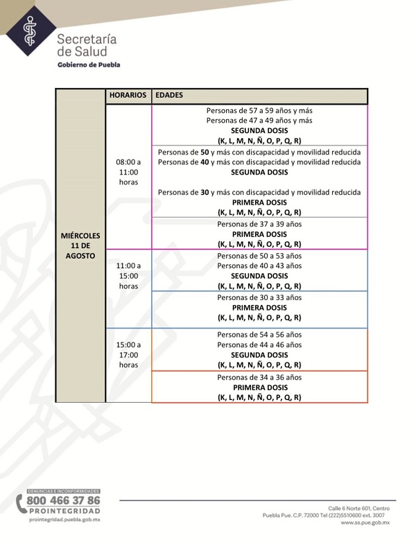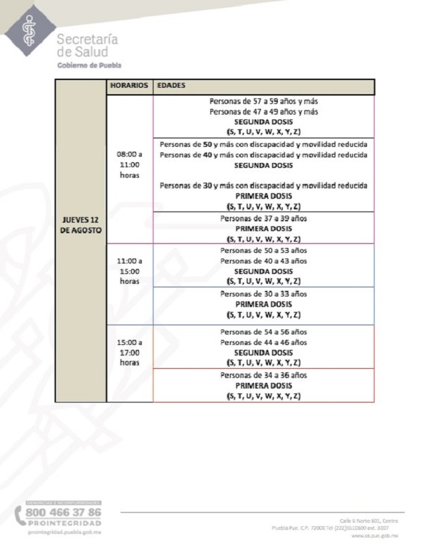 En este proceso, las instituciones que integran la Brigada Correcaminos (Secretaría de la Defensa Nacional, Bienestar, ISSSTE, IMSS, ISSSTEP y los Servicios de Salud del Estado), recomiendan a la población respetar los lineamientos establecidos como son: día de acuerdo con la letra inicial del primer apellido, hora conforme a la edad de la persona que acuda a solicitar el biológico y lugar con base a su colonia o localidad para 30 a 39 años en adelante y mujeres embarazadas.