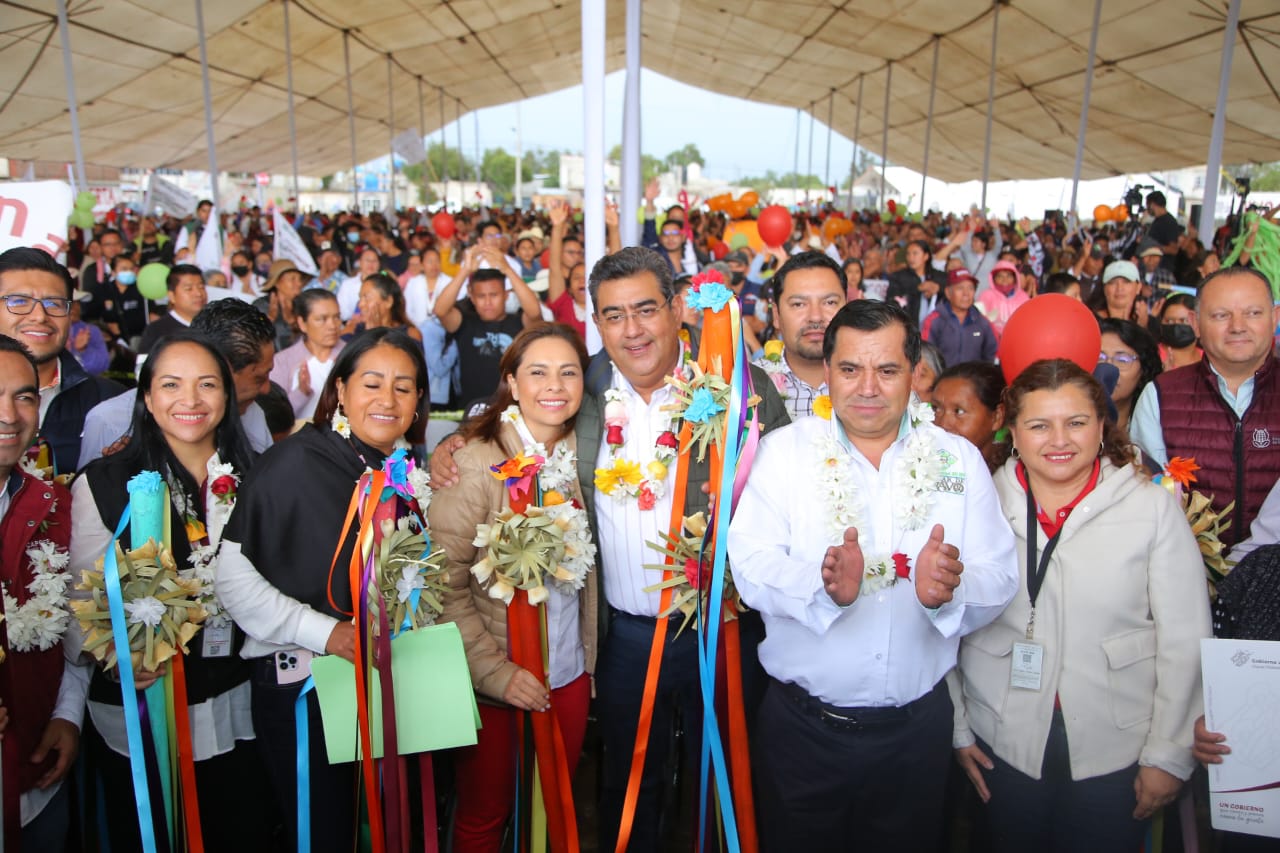 En esta gira de trabajo, Sergio Salomón presidió la inauguración de la construcción de pavimento con adoquín de la calle 8 Oriente y la entrega de 500 acciones de los programas para el bienestar, 96 beneficios de recuperación del campo, 29 títulos de propiedad y una constancia de rehabilitación de espacios educativos.