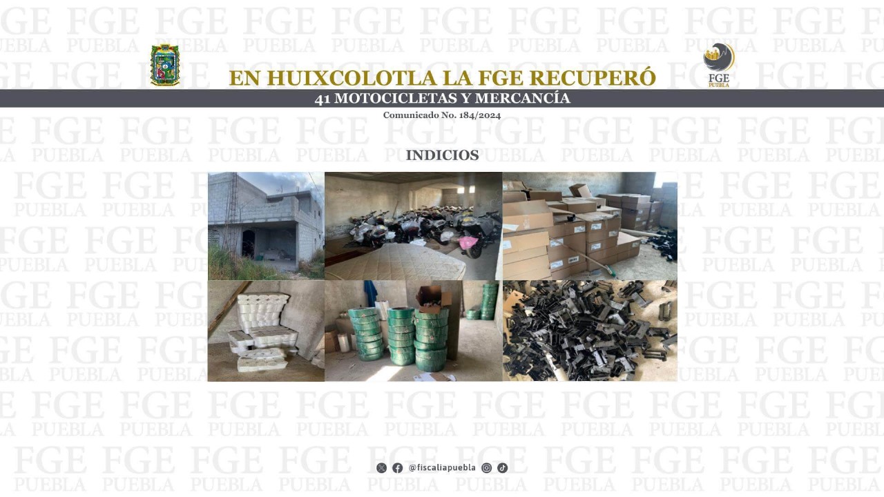 San Salvador Huixcolotla, Pue.- La Fiscalía General del Estado (FGE) de Puebla cumplió una orden de cateo en el municipio de San Salvador Huixcolotla donde aseguró más de 40 motocicletas y diversas mercancías de presunta procedencia ilícita, esto derivado de una investigación por el delito de robo de vehículo agravado.