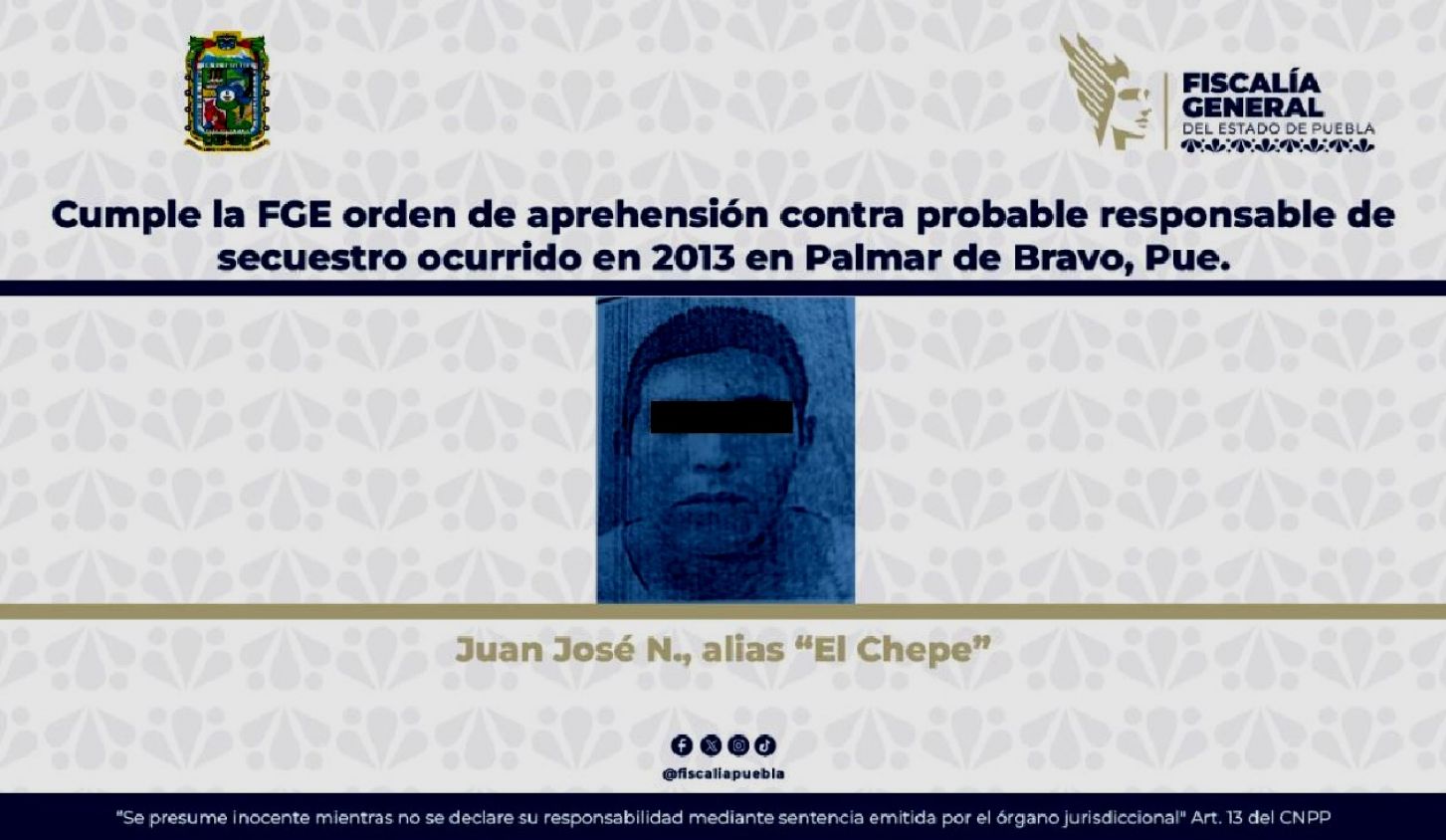 Palmar de Bravo, Pue.- La Fiscalía General del Estado (FGE) de Puebla cumplió la orden de aprehensión por reclusión en contra de Juan José N. alias “El Chepe” de 45 años de edad, como probable responsable del delito de secuestro, ocurrido en el municipio de Palmar de Bravo en el año 2013.
