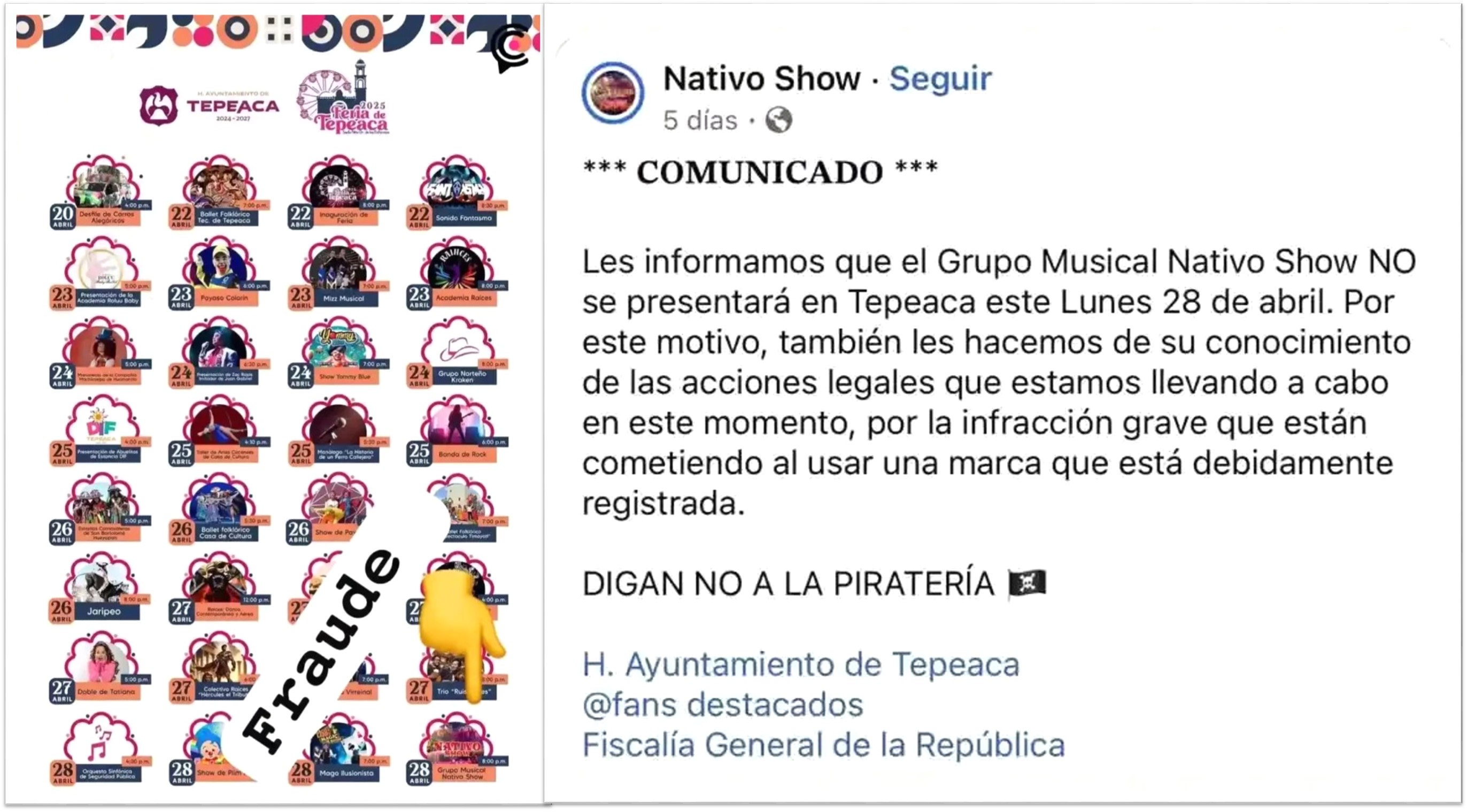 En el texto del comunicado del grupo de música, señala lo siguiente: “Les informamos que el Grupo Musical Nativo Show no se presentará en Tepeaca este lunes 28 de abril. Por este motivo también les hacemos de su conocimiento de las acciones legales que estamos llevando a cabo en este momento por la infracción grave que están cometiendo al usar una marca debidamente registrada. Digan no a la piratería.”