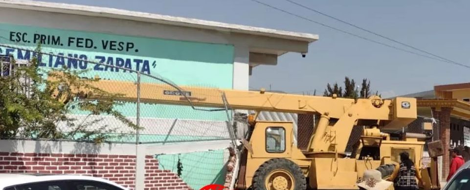 Tepeaca, Pue.- La tarde de este miércoles, una máquina para construcción tipo grúa se impactó contra la barda de la escuela primaria Emiliano Zapata en la comunidad de Santiago Acatlán en el municipio de Tepeaca, en donde afortunadamente no hubo personas lesionadas.