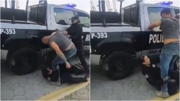 Testigos, también motociclistas, piden a las oficiales que lo suelten, sin embargo, todo cambia cuando el hombre en cuestión se intenta quitar la playera y posteriormente forcejea con las oficiales hasta derribar a una de ellas para golpearla con la rodilla y el puño en el rostro.
