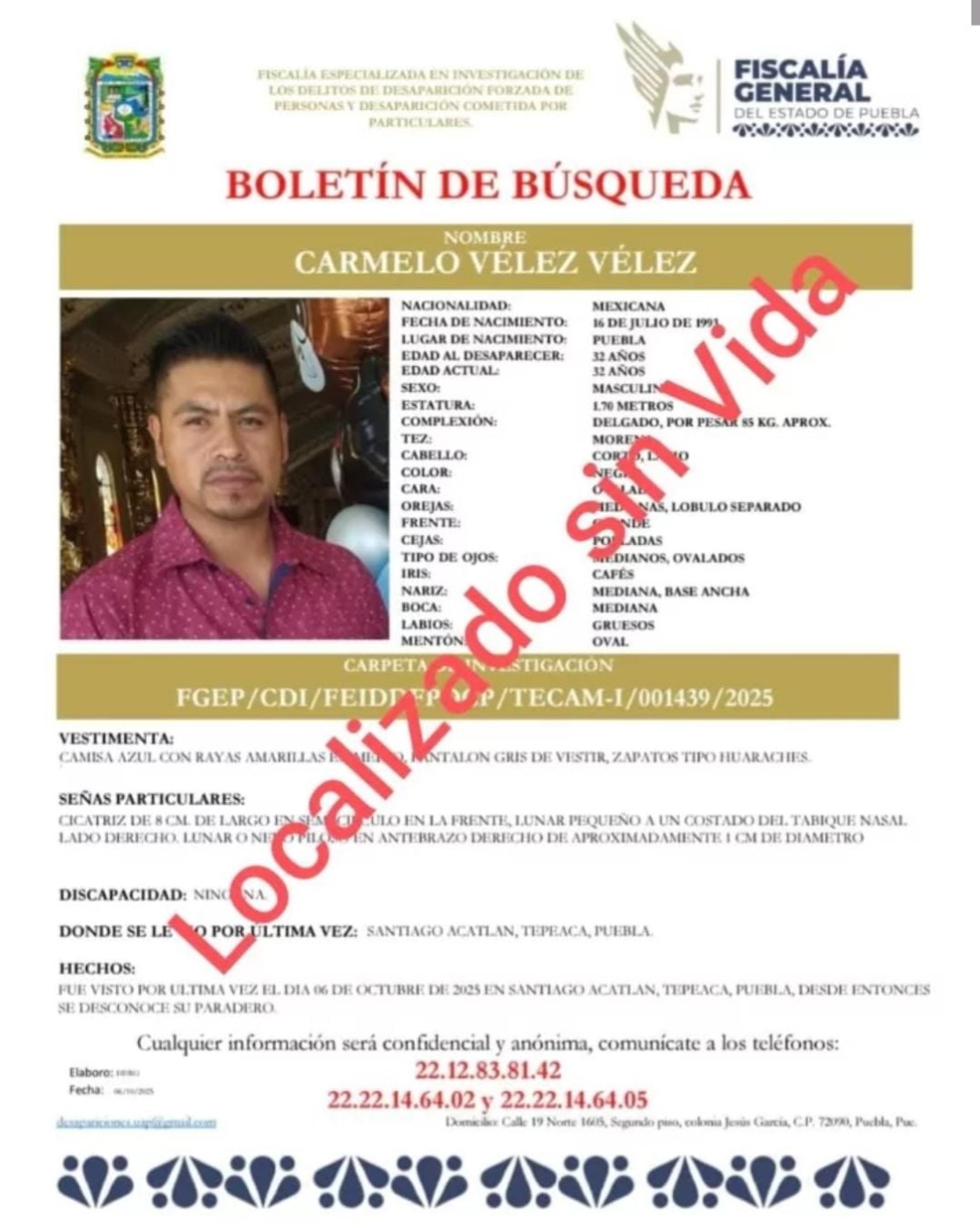 Carmelo V. de 32 años quién fue reportado por sus familiares como secuestrado a plena luz del día por sujetos armados en Santiago Acatlán cuando se trasladaba en un mototaxi; este 7 de octubre fue hallado sin vida y con señas de tortura, en el Periférico Ecológico a la altura de Casa Blanca en Amozoc.