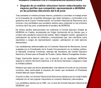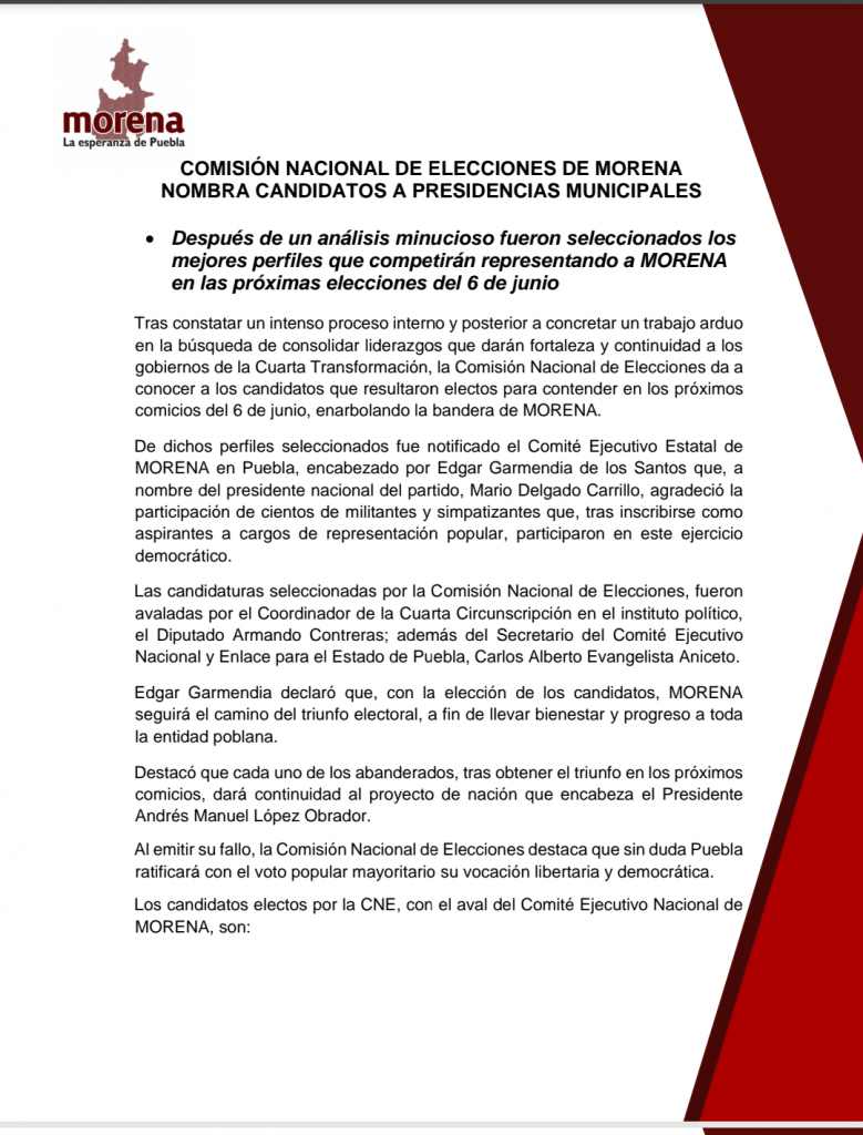 De acuerdo a Regeneración Nacional se realizó un análisis minucioso de los candidatos que buscan dar continuidad al proyecto de la llamada Cuarta Transformación, con cuyos perfiles buscan los triunfos en este proceso electoral de 2021, nombres que ya fueron dados a conocer a la representación de Morena en Puebla.