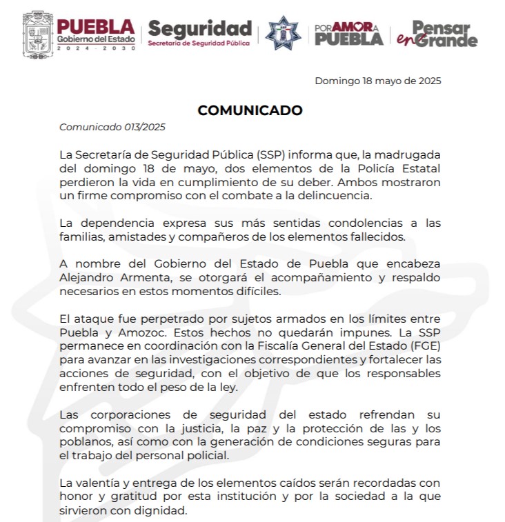 El ataque fue perpetrado por sujetos armados en los límites entre Puebla y Amozoc. Estos hechos no quedarán impunes. La SSP permanece en coordinación con la Fiscalía General del Estado (FGE) para avanzar en las investigaciones correspondientes y fortalecer las acciones de seguridad, con el objetivo de que los responsables enfrenten todo el peso de la ley.